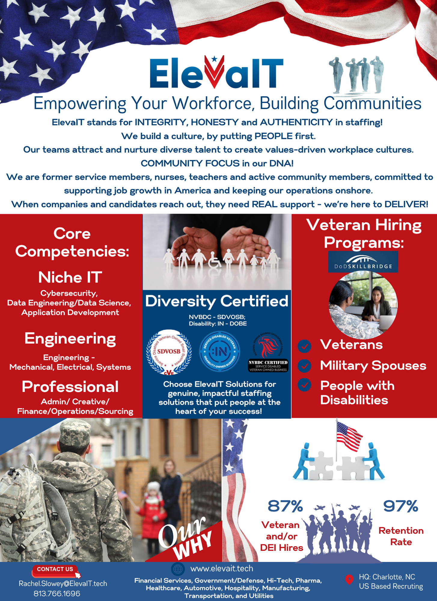 Elevait Solutions is a mission-driven, service-disabled Veteran owned business delivering innovative staffing and workforce solutions with a strong emphasis on diversity, equity, inclusion, and Veteran empowerment. Headquartered in Charlotte, NC and operating remotely, Elevait fosters work-life balance while connecting top-tier talent with leading organizations across the country.