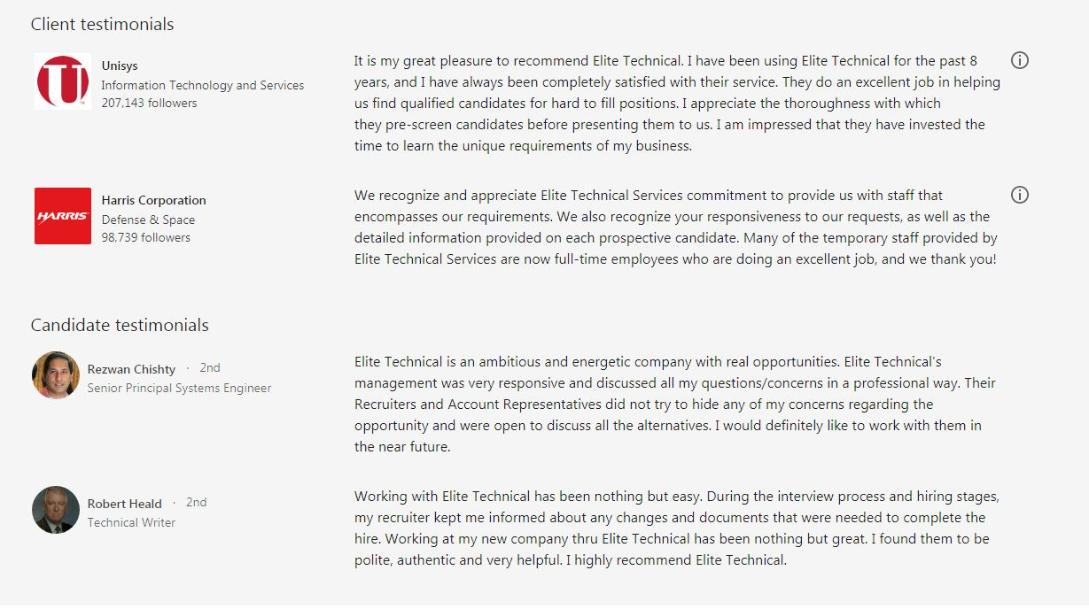 Since its 1992 inception, Elite Technical has grown into a nationally recognized provider of Information Technology and Engineering professionals to commercial and federal markets.