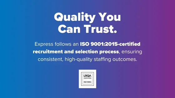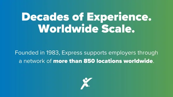 Express Employment Professionals provides customized staffing solutions to help overcome recruiting challenges, manage staffing fluctuations, handle changes in project scope, and navigate seasonal hiring needs. Staffing services from Express are designed to meet the unique workforce requirements and ensure the success of businesses throughout the communities we serve. With specialized industry experience in manufacturing and supply chain staffing, Express has employed more than 11 million people globally since 1983. Express takes a highly systematic and personal approach to match you with the right candidate. Our staffing process includes recruiting, skills evaluation, employment verification, and role matching to meet your needs. For more than 25 years, Express has maintained ISO 9001:2015 certification as part of ensuring quality service.